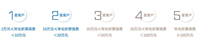 3、在原有規(guī)則基礎(chǔ)上,總保費(fèi)較高的高客,即其總保費(fèi)超過自身星級最低基準(zhǔn)總保費(fèi)(3星200萬、4星500萬、5星1000萬)的部分,每達(dá)到50萬,服務(wù)期延期1年。